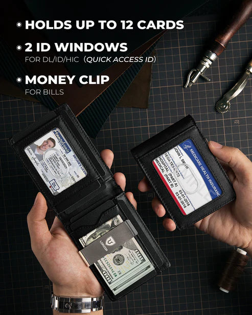 Holds up to 10 cards and cash while staying ultra-slim. Built-in stainless steel money clip keeps your cash secure without bulk.